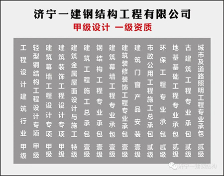 济宁世俱杯app官方入口 钢结构工程有限公司,隶属中煤建设集团,集团注册资金1.0158亿元人民币,下设工程部、设计部、技术部、质检部、生产部、安全部。拥有钢结构施工、设计双甲资质、制造壹级资质,幕墙施工、设计双甲资质,装饰装修施工、设计双甲资质,建筑金属屋面设计与施工特级资质,门窗施工壹级资质,并具有对外承包施工资质和劳务输出资质等九项国家甲级资质。主要从事钢结构世俱杯app官方入口网架工程、管桁架工程、装配式轻钢别墅工程、膜结构工程及大型储罐工程的设计、生产与施工,公司相继承揽了机场航站楼、体育场馆、省级科技馆、大型厂房、高速路服务站、国家石油储库、加油站、储煤仓等各类工程,施工范围涉及全国三十多个省、市、自治区及直辖市,工程质量合格率100%,多年来荣获国内建筑界各类奖项100余个。
