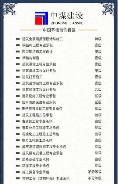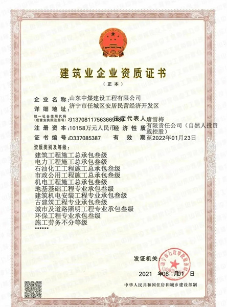 近日,山东中煤建设工程有限公司新增石油化工工程施工总承包叁级、电力工程施工总承包叁级2项建筑企业资质。